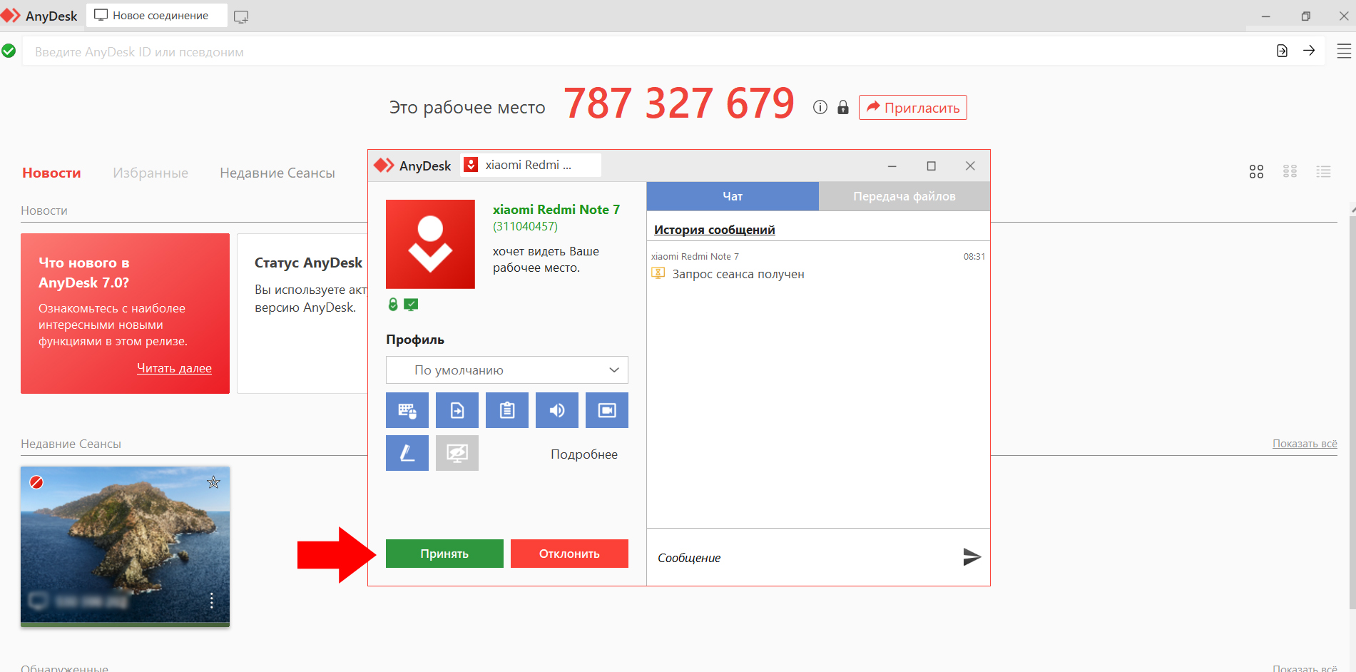 После того, как Вы предоставили адрес Вашего ПК технической поддержке, Вам нужно будет подтвердить подключение, нажав “Принять” на всплывающем окне: